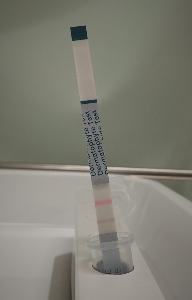 爪の中あるいは爪表面から採取した材料をキット用の液に入れて混ぜ、リトマス紙のようなものにつけ置いて5~30分程で判定します。