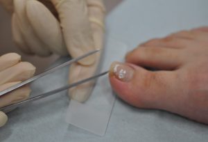 怪しい爪の表面や爪の下をこすってカスをプレパラートにのせます。