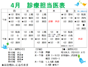 来月から新年度になり、担当医に変更がありますのでお知らせいたします。 新しい常勤のドクターも増えるので、今までよりもよりスムーズに診察できるかと思います。 月曜日は、午前も午後も3診から4診になります。 ・・・